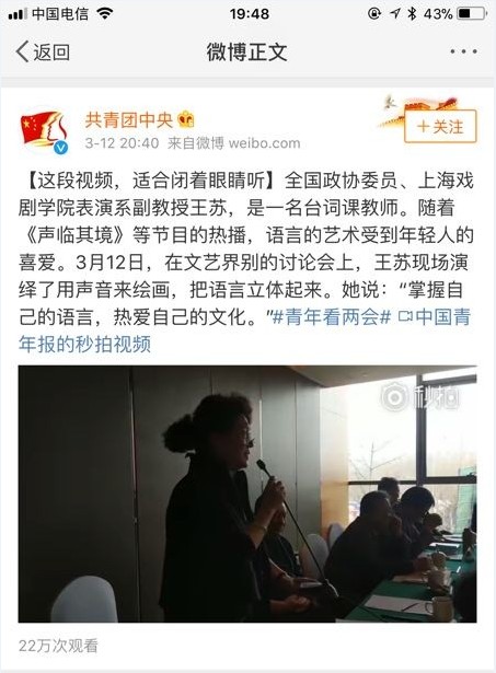 全国政协委员、上海戏剧学院表演系副教授王苏,是一名台词课教师。随着《声临其境》等节目的热播,语言的艺术受到年轻人的喜爱。3月12日,在文艺界别的讨论会上,王苏现场演绎了一段配音,用声音来绘画,将语言塑造的立体有实。对于声音的艺术,她有着自己的看法,她认为青年群体以及社会大众要“掌握自己的语言,热爱自己的文化”。