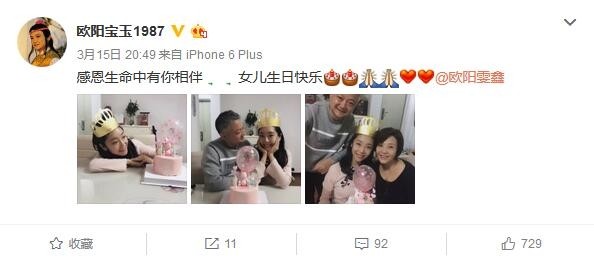 15日,87版《红楼梦》中贾宝玉的扮演者欧阳奋强晒出为女儿庆生的照片,并称:“感恩生命中有你相伴,女儿生日快乐!”照片中,欧阳奋强一家三口互相依偎,十分幸福。