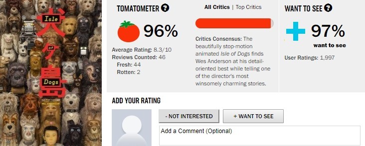 此外,《犬之岛》在烂番茄上的新鲜度为96%(44新鲜、2烂),许多评价认为,韦斯·安德森讲故事的功底很棒,尤其是那种温暖人心又充满幽默的情节。