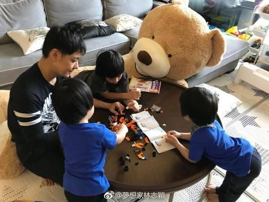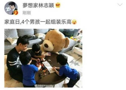 4月8日晚,林志颖晒出和三个儿子一起玩耍的照片,并称:“家庭日,4个男孩一起组装乐高。”照片中,父子四人趴在桌前,一起玩乐高积木,林志颖一脸慈祥的样子,非常有耐心,三个儿子围坐在老爸身边,画面非常的温馨幸福。网友看到此微博后纷纷围观并留言称:“日常羡慕!”“致命诱惑 !”“ 好温馨,好有爱!”