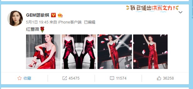 5月1日晚,歌手邓紫棋通过微博晒性感美照,并自称:“红蔷薇!”照片中,邓紫棋头发随意扎在脑后,笑容甜美,站在舞台中央,一袭深红色吊带连衣裤,尽显性感活力。