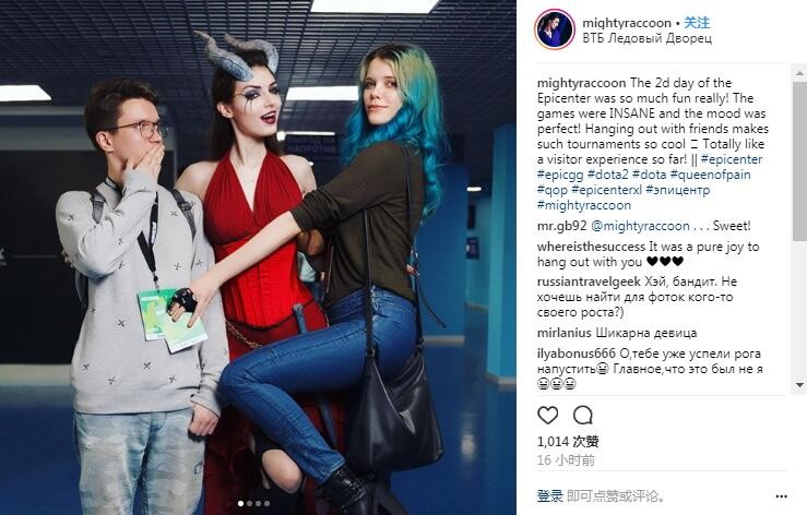 除了和男士玩家合影之外,还有一张和女玩家合影的照片也格外有趣。“痛苦女王”左拥右抱,女玩家的大腿还搭载她身上,一旁的男玩家则一脸“惊呆了”的表情。