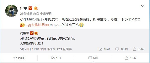 雷军的发言,引起了众多网友的猜测,大家对新品的期待也是多种多样,当然也有不少人讨论小米Max 3,由于这个系列定位大屏、长续航,所以用户群体也是不少。现在,有用户直接在微博上发帖询问,Max 3真的被砍了么,而雷军也是出面进行了回应。