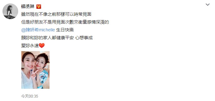 5月31日是陈妍希35岁生日,杨丞琳在微博晒出两人亲密合照为其庆生,并配文:“虽然不像之前那样可以时常见面,但是好朋友不是用见面次数来衡量感情深浅的。陈妍希生日快乐,愿你和你的家人都健康平安 心想事成,爱你永远。”