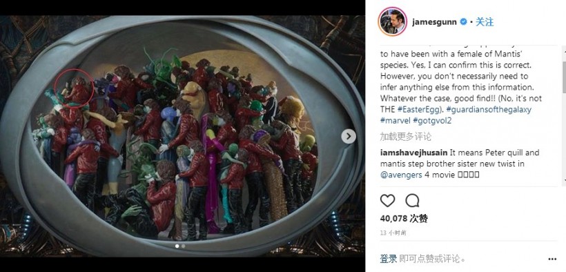 詹姆斯古恩在INS上向影迷证实,《银河护卫队2》中伊戈的后宫之中,的确有一位和螳螂妹相同种族的女性。