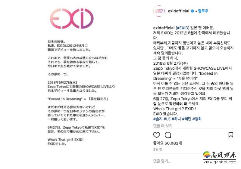 EXID 这周在官方 Instagram 上公开了官方声明,开头就向日本的粉丝喊话:「我们 EXID 於 2012 年 8 月在韩国出道,从当时至今虽然有好几次撞上高高的墙,但我们始终没有放弃梦想、一直带著信念来到了今天。」