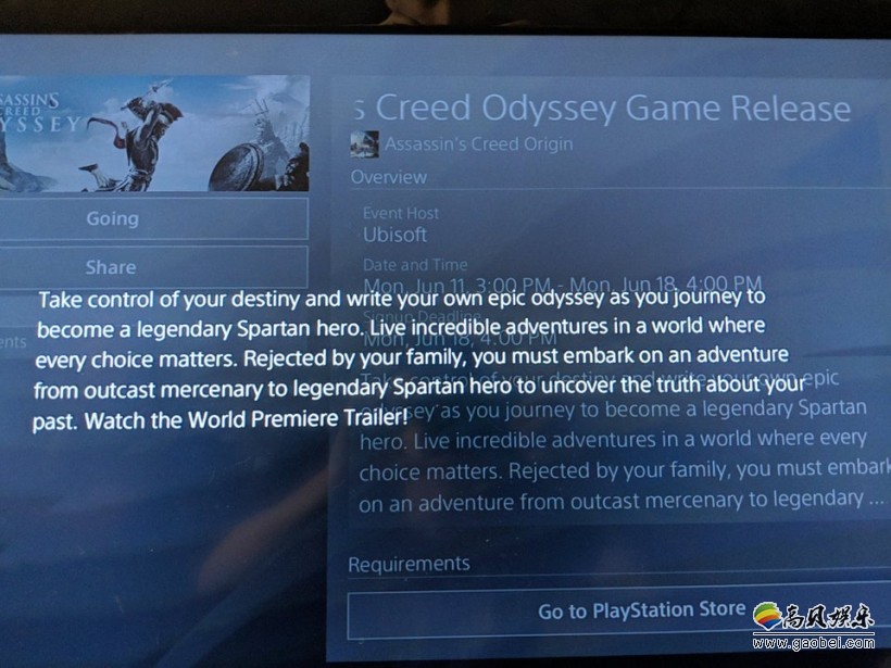 图中的描述为:“掌控你自己的命运,书写自己成长为斯巴达英雄之路的冒险史诗。在每个选择都很重要的世界里,被家人所抛弃,你开始了一场从雇佣兵到传说中的斯巴达英雄的冒险,探寻你过去身世的真相。”最后还提到了会有全球首映预告,不过在E3的发布会应该就可以看到了。