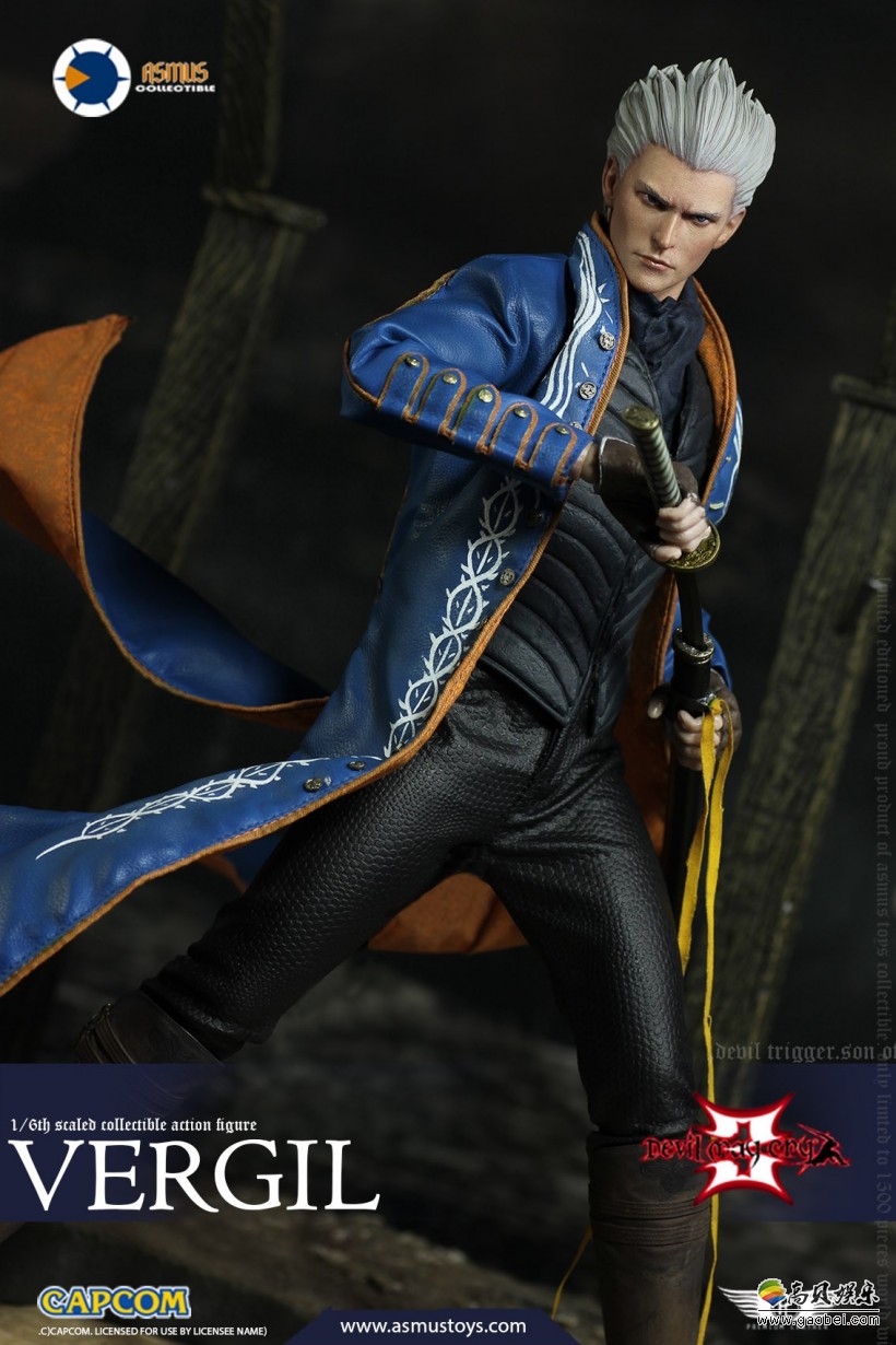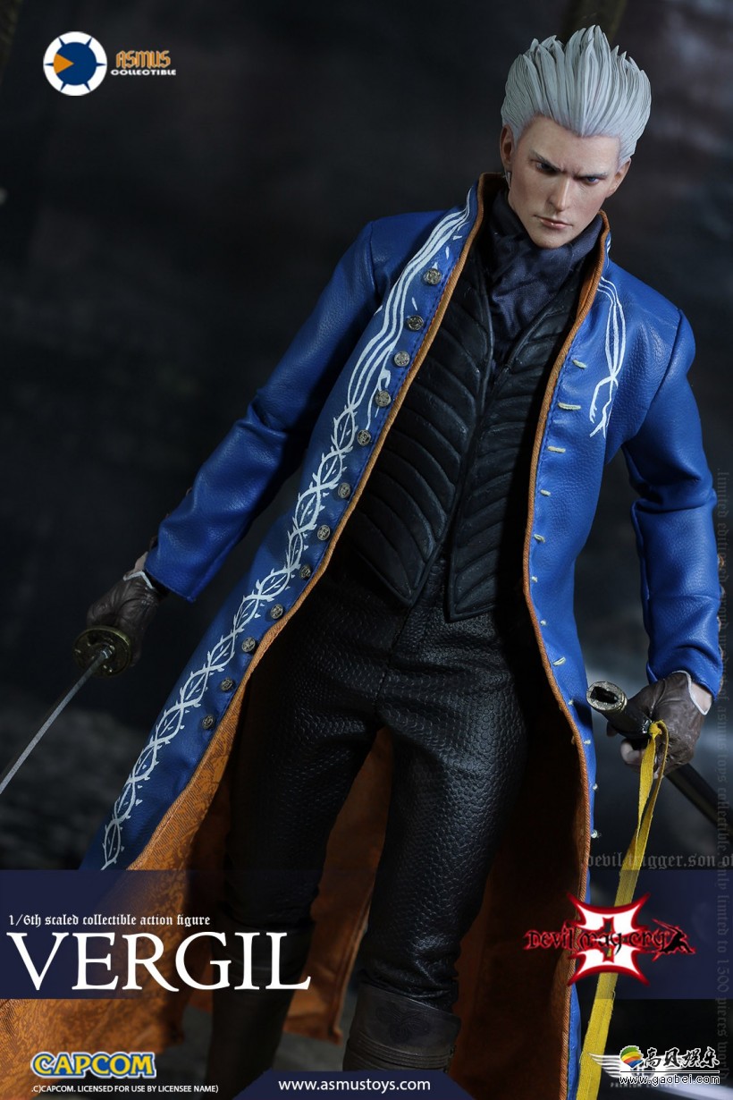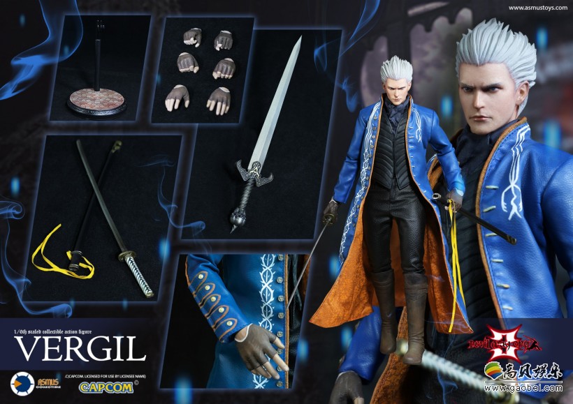 维吉尔可动手办高约29.5cm,超过32个可动关节,3种替换手型,衣服造型非常还原,蓝色外套、颈巾、靴子、皮裤以及PVC材质的背心。