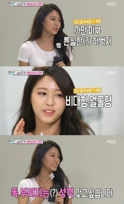 当日,在被问到对自己的身材部位感到最自卑的地方时,雪炫回答道,"我对于自己的黑皮肤、壮实的大腿已经不对称的脸型很自卑。"