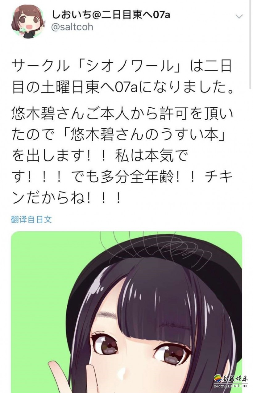 此外,しおいち还表示自己创作的同人本已经获得了悠木碧的同意和授权,并且这部作品“大概会是全年龄向”,不知道内容会有哪些劲爆的要素?如果这次以声优为原型绘制同人本的行动成功的话,那么接下来是否也会有花泽香菜、佐仓绫音等人的本子相继问世呢?想象一下很让人期待……