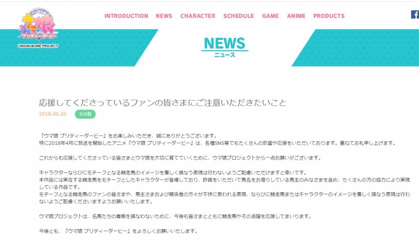《马娘》这部动画的各个赛马娘均可在现实世界中寻找原型,官方也是通过各种努力得到了马主和赛马人士的授权才得以实现作品的创作。然而随着动画的开播,作品名气不断增长,同人创作水准参差不齐甚至有人恶意损毁角色形象,致使引发赛马爱好者和相关人士不满,最终官方发布公告,希望大家在创作的时候不要蓄意恶搞,损毁这些赛马的名字和形象。