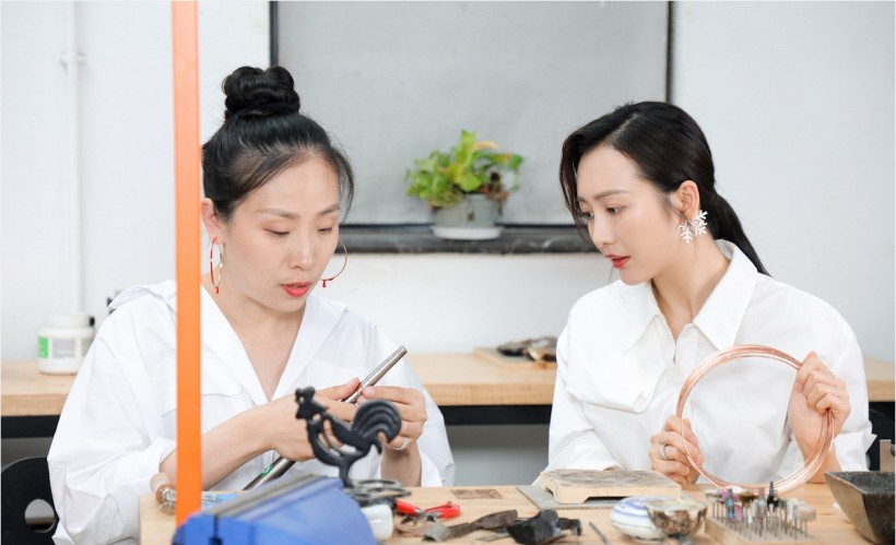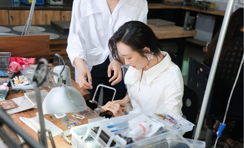 王鸥对于珠宝设计的喜爱,是因为小时候,她的婆婆喜欢唱粤剧,有很多亮闪闪是头饰,她那时候就对自己做饰品产生浓厚的兴趣,妈妈的零花钱,她都拿去买一些小珠子自己DIY成各种饰品,戴在手上、头发上。在这次校园体验中,王鸥对于老师教授的每一个知识点都仔细聆听,每一个细节都动手体验,亲手设计制作饰品,实现了一个儿时的心愿。