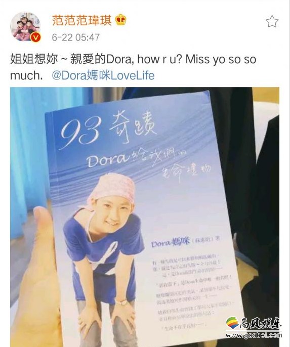 近日,范玮琪在社交平台分享了一本书籍《93奇迹.Dora给我们的生命礼物》,并表示“姐姐想你~亲爱的Dora, how r u? Miss yo so so much. ”。93其实是台北荣总93病房,奇迹不是骨癌得医治,而是指进出93病房的人都希望把爱与关怀散播出去,而书籍的主角Dora是一位患有骨癌的女孩。