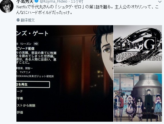 小岛秀夫:“在Netflix上看了千代丸桑(5pb社长)的《命运石之门0》第一话,主人公冈部伦太郎实在是太冷酷无情了。”