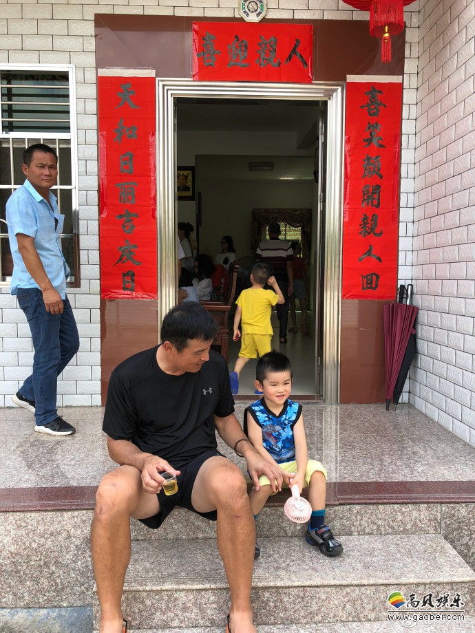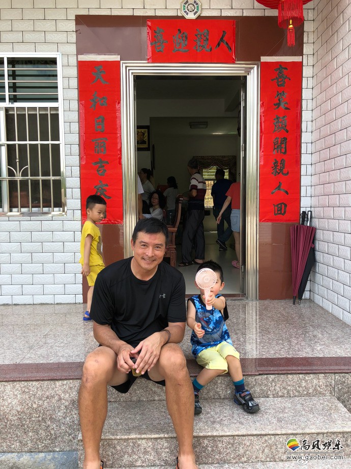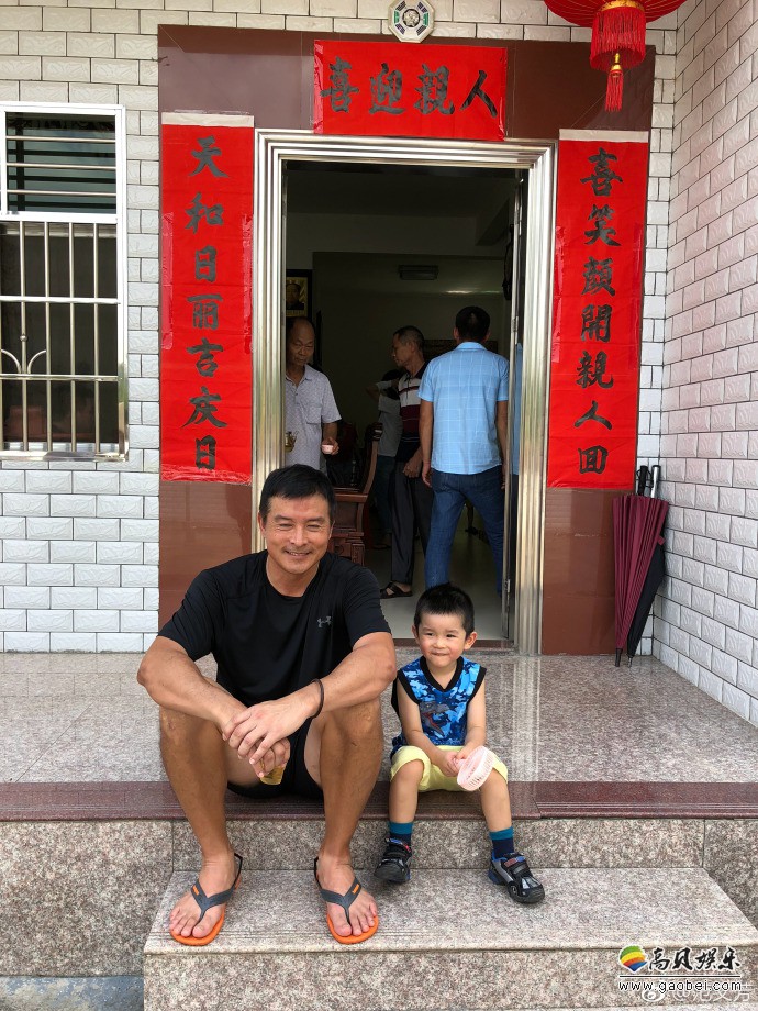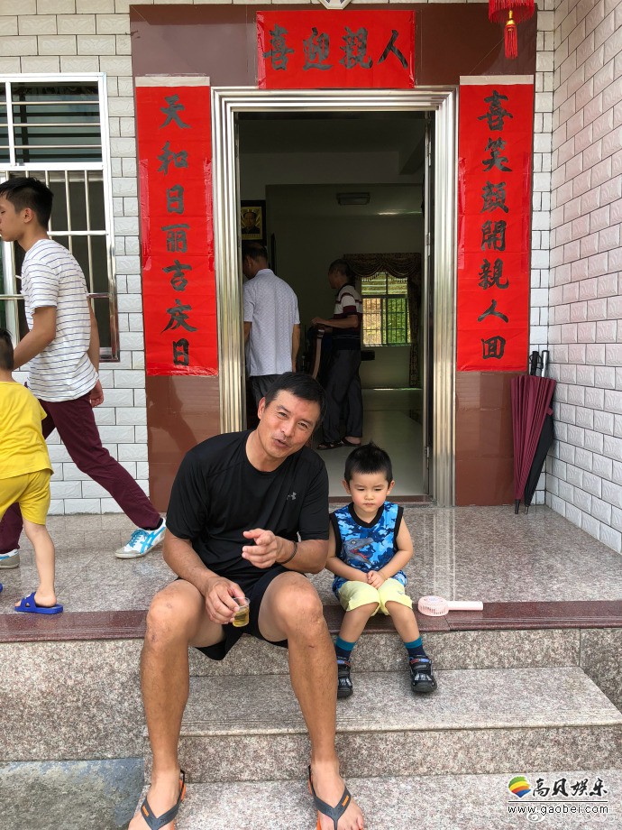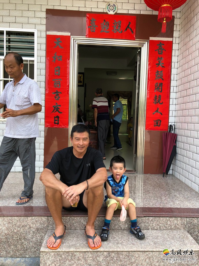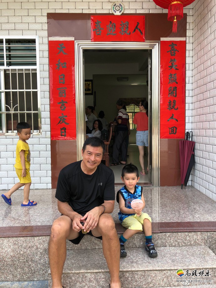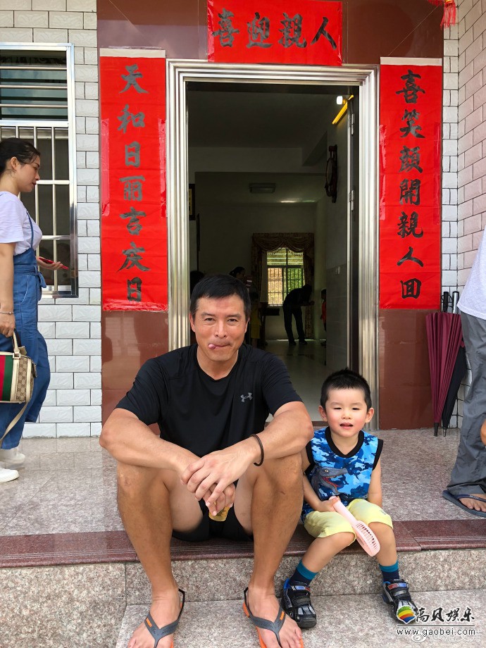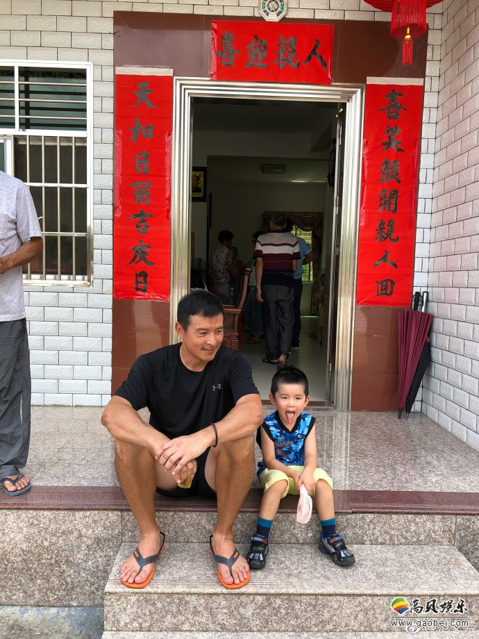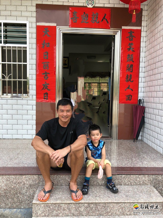 范文芳微博晒出照片:丈夫李铭顺和儿子坐台阶上,吐舌卖萌,笑容满面