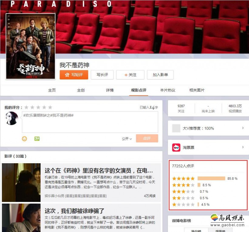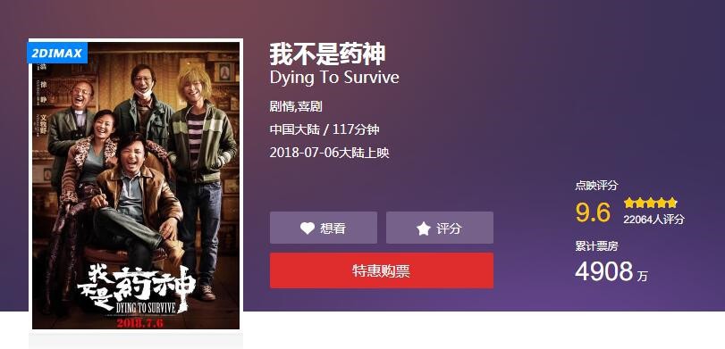 这两天徐峥主演的新片《我不是药神》在全国范围内进行点映,票房累计超过4900万,上座率高达36%。猫眼评分目前稳定在9.6分,微博上也有85.8%的观众给出了五星,评价应该说是相当高了。