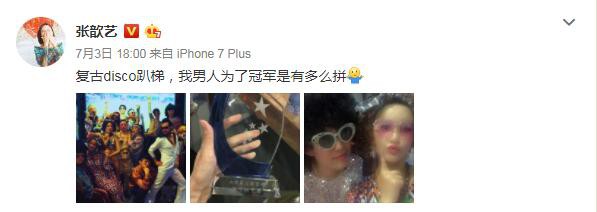 3日,张歆艺在微博晒出party照,并配文:“复古disco趴梯,我男人为了冠军是有多么拼。”照片中,张歆艺与袁弘领衔,众人都是上世纪80年代舞厅disco复古风的打扮,群魔乱舞的画面有点辣眼。