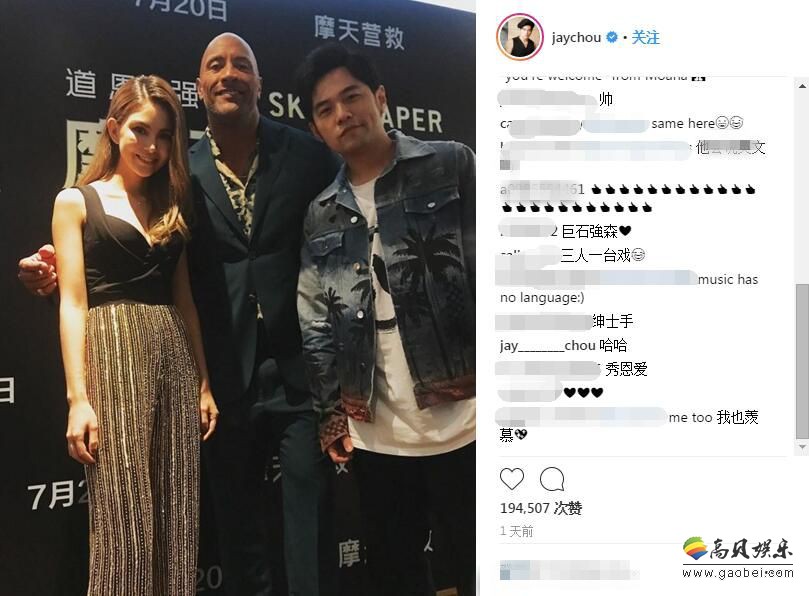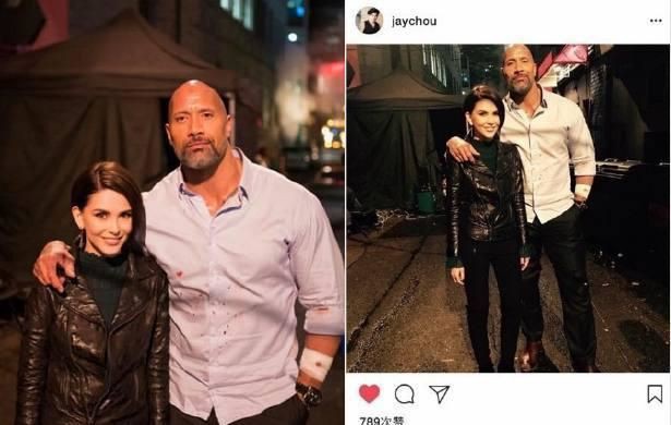 周杰伦向来在娱乐圈中有“宠妻狂魔”之称,近日随着天王嫂昆凌的新片《摩天营救》即将上映,杰伦也现身了北京发布会为娇妻捧场,并在ins上给分享了夫妻与巨石强森的合影,图中巨石强森绅士手获得网友大赞。
