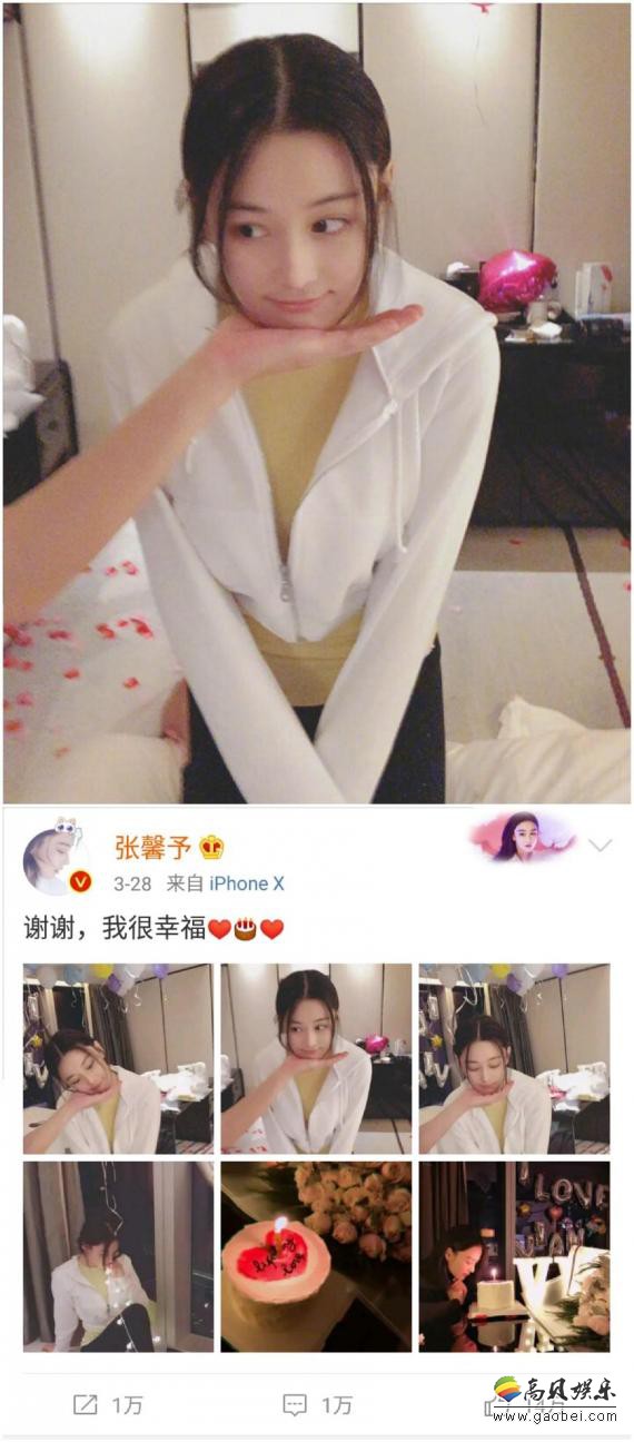 拍照的当天应该是张馨予的生日,周围布置成了生日会现场,她穿着黄色毛衣加白色的外套笑的恬静美好的被一男子捧在手心,有玫瑰还有一个心形蛋糕,整幅图片都透露着甜甜的恋爱气息。再加上她配的文字“谢谢,我很辛福”,就是恋爱了呀!