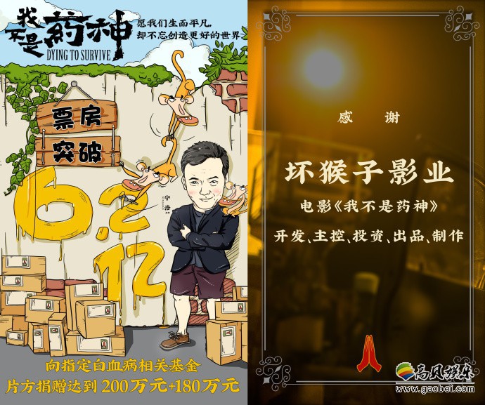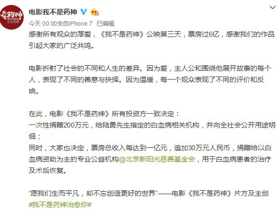 《我不是药神》官微宣布公映3天电影票房已经突破了6亿,除了票房佳绩外,官方还带来了一个好消息,他们将一次性捐赠200万元给电影原型陆勇指定的白血病相关机构,并且票房总收入每达到一亿元,追加30万元人民币,捐赠给以白血病资助为主的专业公益机构@北京新阳光慈善基金会,加上6亿票房的180万,目前捐赠额已达380万元。