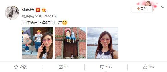 7月6日,林志玲在自己微博上传一组美照,并配文称:“工作结束,高雄半日游!”照片中的她身穿灰底蕾丝公主领上衣,面戴粉色少女心墨镜,手比V字,卖萌自拍。