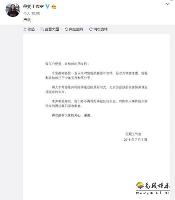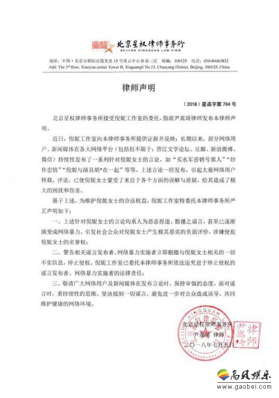 此前,网传2016年曝光恋情的井柏然倪妮是合约情侣,两人的恋情是为了彼此的炒作,甚至传逛街被拍是摆拍。近日倪妮工作室委托律所,提供证据并反映,长期以来部分网络用户和新闻媒体,在各大平台,持续性发布了一系列对倪妮的不实言论,如买水军营销号黑人,炒作恋情,倪妮与某胡姓演员在一起。这些不实言论,对倪妮本人造成了极恶劣的影响,和来自各个方面的质疑和误解。因此,工作室认为该不实言论对倪妮造成名誉权的侵害,并要求相关主体停止散发不实言论。