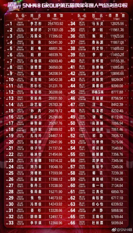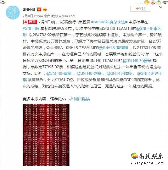7月8日晚,SNH48团体官方微博发布“砥砺前行” 第五届SNH48年度总决选中报结果公布,李艺彤、黄婷婷、冯薪朵获得前三名。