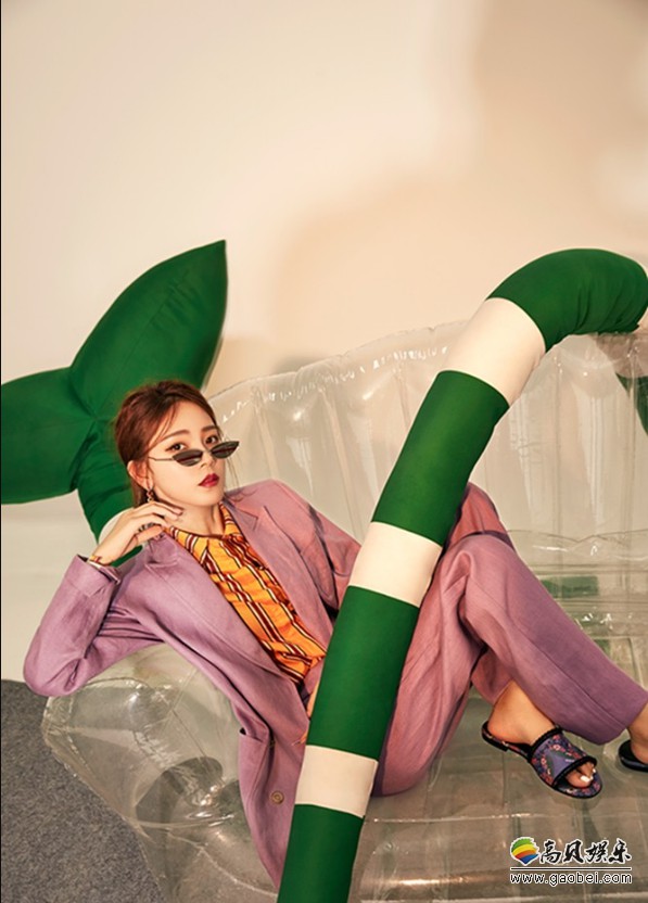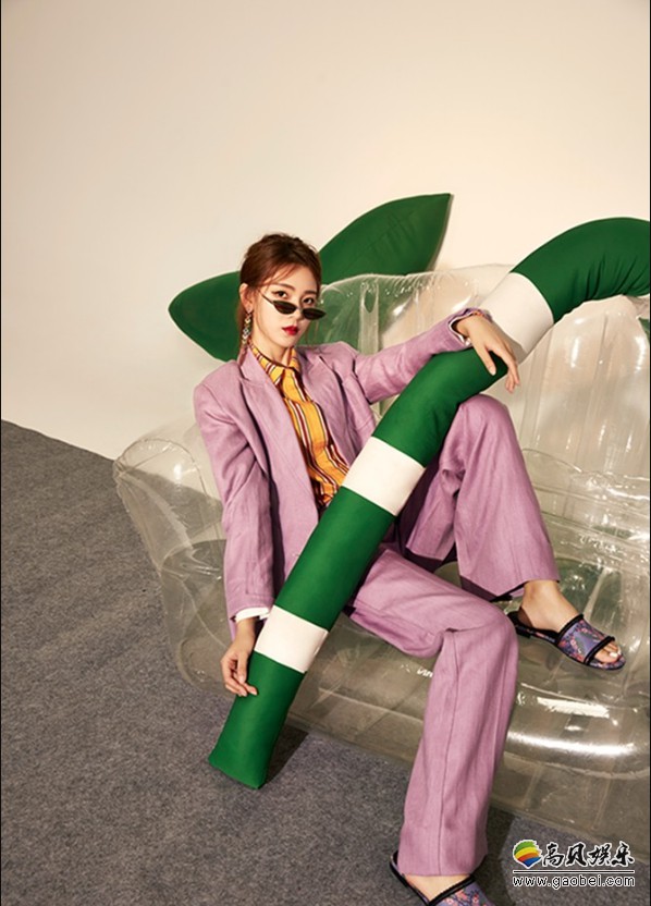 眉眼精致,慵懒美艳,而与红色相对应的是一套冰淇淋紫色羊毛西服,内搭黄色条纹衬衫碰撞出盛夏的清新柔和色彩。