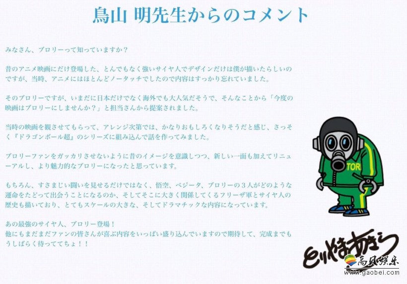 根据《龙珠》官方于7月10日早间透露的情报,《龙珠:超 布罗利》剧场版将再次邀请强悍的赛亚人战士布罗利登场,并且原作者鸟山明老师还专门写下一些留言文字:“各位都知道布罗利吗?这是以前我制作过人设,并且只在动画里登场的强悍赛亚人,不过当时我并没有涉足动画的事项,所以这些都忘记了。由于布罗利在日本和海外都有着很高人气,所以担当编辑提议‘这次剧场版就让布罗利出场吧’。在看过以前的剧场版之后,我感觉非常有趣,于是决定让他也加入到《龙珠:超》的故事里。”