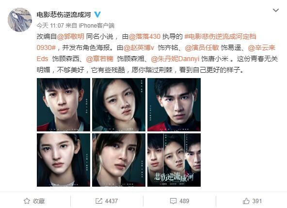 改编自郭敬明同名小说,由作家落落执导的电影《悲伤逆流成河》宣布定档9月30日,并发布一组角色海报。