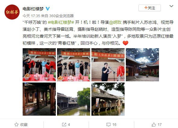 电影红楼梦官方公布了由胡玫导演执导的全新电影版《红楼梦》的开机组图,导演胡玫、制片人苏志鸿、视觉导演赵小丁、美术指导霍廷霄、摄影指导赵晓时、造型指导陈同勋等亮相河北香河天下第一城,本片主演将全部启用全球海选的新人演员。