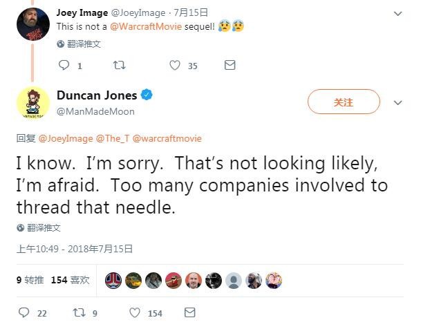琼斯在回复中写到:“我知道,我很抱歉。恐怕那个(《魔兽》续作)看起来不太可能了,这需要太多的公司合作才能成功。”