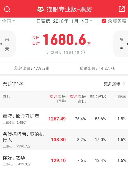 根据猫眼专业版统计数据来看,《毒液:致命守护者》自上映起,已经连续6天蝉联单日票房冠军,总票房超9亿元,今日有望达到10亿,据Deadline报道,《毒液》全球票房已经突破7亿美元。