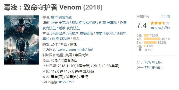 《毒液》目前已经在内地上映10天,豆瓣评分7.4分,口碑尚可。