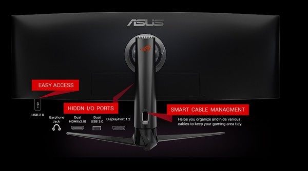 显示器支持左右16度旋转、上下120毫米高度调节、+20度到-5度俯仰调节,接口有一个USB 2.0、两个USB 3.0、一个3.5mm耳机孔、两个HDMI 2.0、一个DisplayPort 1.2。花哨的RGB信仰灯倒是没有,只在背部支架上有一个红色的败家之眼标识。