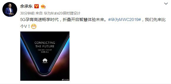 余承东:“5G孕育高速畅享时代,折叠开启智慧体验未来。#华为MWC2019#,我们先来比个V!”