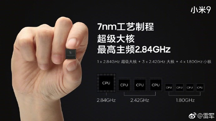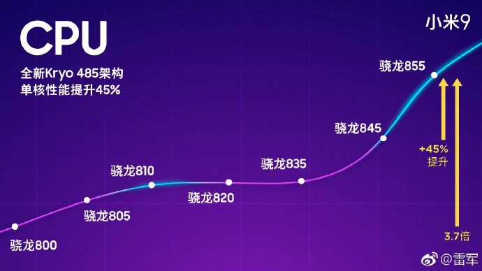 雷军还表示,骁龙855是800系列近年来最大幅度的一次升级,不仅是最新的7nm工艺制程,CPU更是拥有“超级大核”,主频高达2.84GHz,单核性能跃升45%。