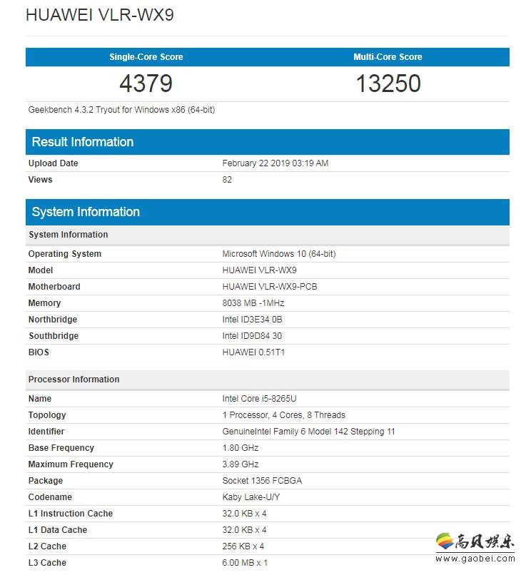 现在IT之家发现,这款华为MateBook笔记本新品已经在GeekBench跑分网站上现身,测试型号是HUAWEI VLR-WX9,搭载Windows 10系统,配备Intel Core i5-8265U处理器,8GB内存,单核跑分为4379分,多核跑分为13250分。