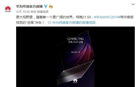 今天华为官方在微博中表示,“更大视野里,蕴藏着一个更广阔的世界。明晚21:00,#华为MWC2019#带你感受视觉的“全面”冲击!”从视频中我们也可以看出,华为新款MateBook笔记本电脑将采用更窄边框的全面屏设计,而且机身看起来更加轻薄。