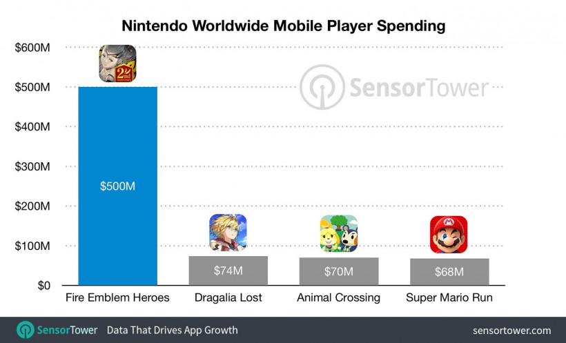 值得一提的是,从Sensor Tower统计的数据来看,任天堂旗下收入最高的手游当属2017年2月推出的《火焰纹章:英雄》,截至本月中旬时这款游戏带来的收入已经超过了5亿美元,任天堂旗下的其他几款手游作品几乎是望尘莫及。不过Sensor Tower指出,1月时《失落的龙约》月收入1570万美元,这一数字与《火焰纹章:英雄》(2070万美元)差距并不是那么巨大;另外,《失落的龙约》目前只在5个国家和地区发行,而《火焰纹章:英雄》则是在40个国家和地区推出,这一点同样造成了相当的影响。