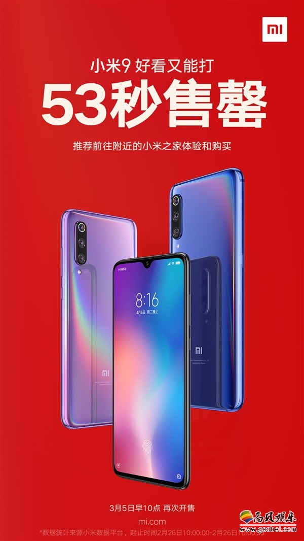 2月26日上午10点,小米9正式发售,6GB+128GB版售价2999元,8GB+128GB版售价3299元。官方数据显示,小米9首销仅用了53秒即售罄,人气火爆。下一轮发售时间是3月5日早上10点,同时本周五(3月1日)小米9透明尊享版、小米9 SE正式发售。