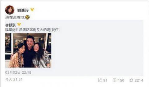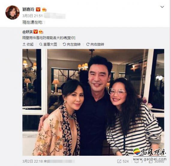3月3日晚,刘嘉玲转发此微博并逗趣回应,称:“现在还在吃!”