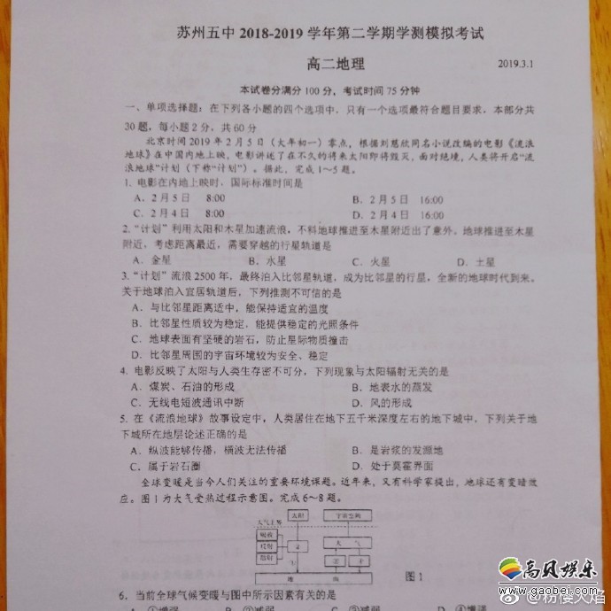 科幻电影《流浪地球》可以说是今年春节档最大的黑马,热度一直不减,也有学校与时俱进,将它纳入了试卷。微博网友Po出了苏州某高中的地理考试题,其中前5道是围绕《流浪地球》展开的,并喊话电影导演来答题。