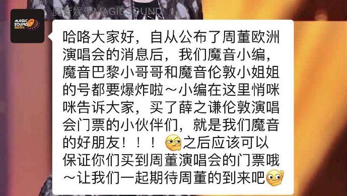 此前,曾有粉丝晒出群聊天记录爆料,主办方魔音娱乐的负责人称:“买了薛之谦伦敦演唱会门票就是好朋友,应该就可以保证买到周杰伦的门票。”