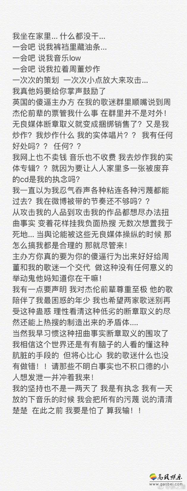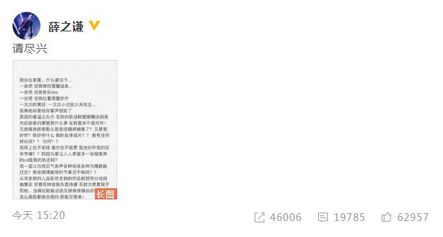 今日,薛之谦在自己微博发文,否认捆绑周杰伦炒作,正文中表示:“我炒作什么?我的实体唱片?我有任何好处吗?”还称:“我对杰伦前辈尊重至极。”