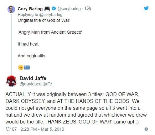 最近官方就为我们解开了谜团,在和《战神》总监Cory Barlog进行推特互动时,《战神》之父David Jaffe透露游戏最初有三个候选名,除了“战神”之外,还包括“黑暗奥德赛(DARK ODYSSEY)”和“众神之手(AT THE HANDS OF THE GODS)”,最后通过抽签随机抽到了“战神”。