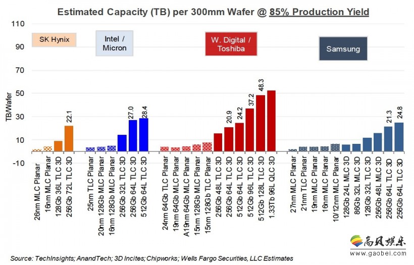 TI按照85%的良率对四大颗粒厂(SK海力士、Intel、西数/东芝、三星)旗下的各技术产能做了预测,最顶级的300mm晶圆(12寸)可以切割48.3TB容量的512Gb 128层TLC,如果是QLC,那么产出将更加可观。