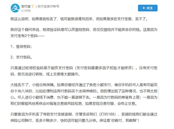 支付宝表示,通过短信校验码,只能更改登录密码,但不能改支付密码(支付密码需要多因子校验才能修改)。没有支付密码,就无法进行转账、线上交易等大额操作。