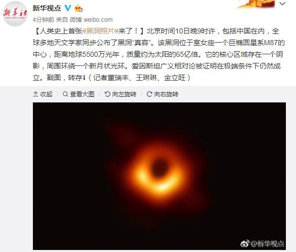 根据@新华视点微博发布的消息,照片中的黑洞于室女座一个巨椭圆星系M87的中心,距离地球5500万光年,质量约为太阳的65亿倍。它的核心区域存在一个阴影,周围环绕一个新月状光环。爱因斯坦广义相对论被证明在极端条件下仍然成立。