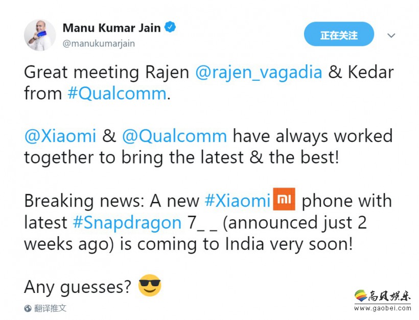 4月27日消息,小米印度业务负责人Manu Kumar Jain在推特透露,搭载高通最新的骁龙7系列移动平台的小米新机很快就会来到印度,大家猜猜是什么?